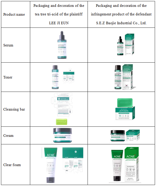 In 2021, the plaintiff entrusted the Beijing Unitalen Law Office to conduct an investigation, in which it was found that the product packaging and decoration of "Tea Tree Acne Clearing and Whitening Toner", "Tea Tree Cleansing Bar" and other skincare products produced, sold and promoted by the defendant Shantou S.E.Z Baojie Industrial Co., Ltd. directly copied and imitated the above plaintiff's packaging and decoration designs of the tea tree tri-acid series of cosmetics and the black snail serum of "SOME BY MI/莎柏蜜" which already had relatively high popularity and influence. The defendant used labels similar to those of the plaintiff, leading to confusion and misunderstanding among consumers. Therefore, as the person benefiting from the rights and interests of the packaging and decoration of the tea tree tri-acid and the black snail serum, the plaintiff appealed to the Shantou Intermediate People's Court in Guangdong Province. The Shantou Intermediate People's Court ruled that the packaging and decoration of the tea tree tri-acid and the black snail serum claimed by LEE JI EUN constitute the packaging and decoration with certain influence and that the act of S.E.Z Baojie Industrial Co., Ltd. in producing and selling the tea tree tri-acid and the black snail serum constitutes unfair competition. As the compensation amount did not meet the plaintiff's expectations, the plaintiff later appealed to the High People's Court of Guangdong Province, which made a ruling of upholding the first instance ruling ultimately.