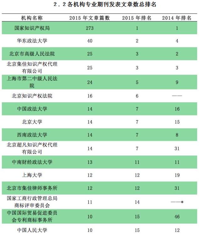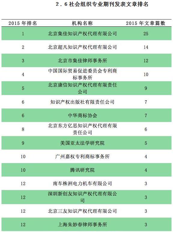 日前,上海知識產(chǎn)權(quán)研究所對2015年度我國知識產(chǎn)權(quán)專業(yè)文章發(fā)表情況進行了統(tǒng)計分析,在包括科研院所、司法系統(tǒng)、政府部門、社會組織等各機構(gòu)文章發(fā)表總量排名中,集佳緊隨國家知識產(chǎn)權(quán)局、華東政法大學(xué)、北京市高級人民法院,以全年發(fā)表量25篇的成績,領(lǐng)跑社會組織類機構(gòu)。此外,北京市集佳律師事務(wù)所以全年發(fā)表12篇的成績在社會組織類機構(gòu)排名中名列第三。