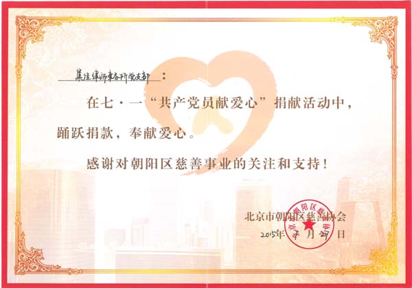 為充分發(fā)揮共產(chǎn)黨員的先鋒模范作用,集佳律師事務(wù)所積極響應(yīng)朝陽區(qū)律協(xié)開展的“共產(chǎn)黨員獻愛心活動”,在活動中積極踴躍的奉獻自己的愛心,得到了朝陽律協(xié)黨政的肯定與贊揚。集佳黨員將繼續(xù)發(fā)揮模范作用并堅持為社會做貢獻。