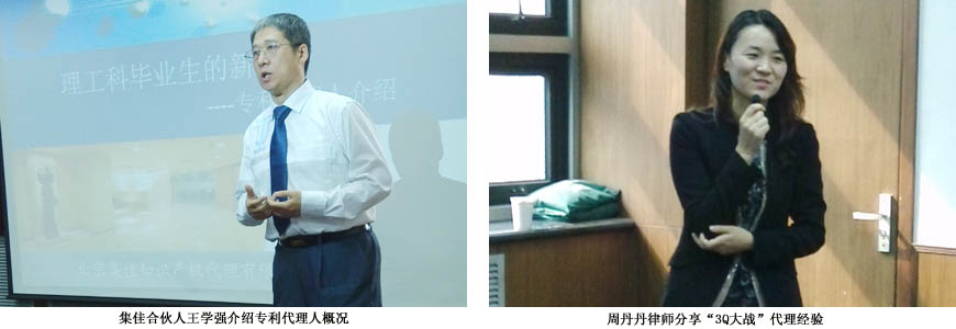 活動中,北京市代理人協會副會長、集佳合伙人王學強為同學們介紹了專利代理人的職業概況,使大家對知識產權和專利代理人行業有了更客觀的了解。知名代理律師周丹丹則與大家分享了“3Q大戰”的代理經驗,充分展現了律師的代理風采。宣講過程中,大家圍繞專利代理人的職業規劃和發展前景、律師在代理案件過程中總結的難點、解決方法和思路等問題與兩位專業人士進行了熱烈討論。