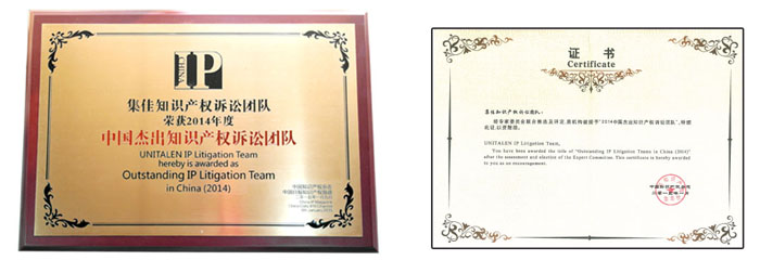 由《中國知識產(chǎn)權(quán)》雜志與中國日報知識產(chǎn)權(quán)頻道聯(lián)合主辦的“第五屆中國知識產(chǎn)權(quán)新年年會暨論壇”于2015年1月9日—10日在北京舉行,晚宴上對“第二屆中國杰出知識產(chǎn)權(quán)訴訟團隊”進行現(xiàn)場頒獎,集佳律師事務(wù)所繼2013年獲得該年度“中國杰出知識產(chǎn)權(quán)訴訟團隊”獎之后,再次憑借其五星級的業(yè)務(wù)能力、專業(yè)能力、研究能力以及團隊凝聚力,榮獲“2014年中國杰出知識產(chǎn)權(quán)訴訟團隊”獎。