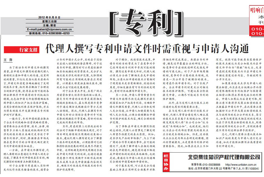 《中國知識(shí)產(chǎn)權(quán)報(bào)》:代理人撰寫專利申請(qǐng)文件時(shí)需重視與申請(qǐng)人溝通