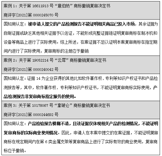 通過上述案例可見,不論是國知局還是法院階段,均有大量的裁定及判決直接認定:產品檢測報告僅為產品檢測情況,無法證明商品進入市場流通流域,不應認定為商標法意義上的使用證據。但是針對該問題并沒有統一的裁判標準,司法實踐中,也不乏案件綜合考量了產品檢測報告。部分案例列舉如下: