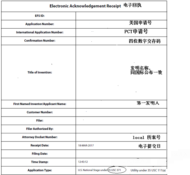 應核查電子回執中的基本信息,并通過核查電子回執中的信息來判斷申請類型是否正確。以下是對電子回執的摘錄說明,供參考。從該摘錄說明中可看出,當Application Type顯示為 U.S.National stage under 35 U.S.C. 371時,則說明該美國申請是PCT進入美國國家階段的申請;當Application Type顯示為 Utility under 35 U.S.C. 111(a)時,則說明該美國申請是PCT進入美國國家的申請(就整體而言,也可能是巴黎公約申請,但本節主要針對PCT進入美國介紹)。