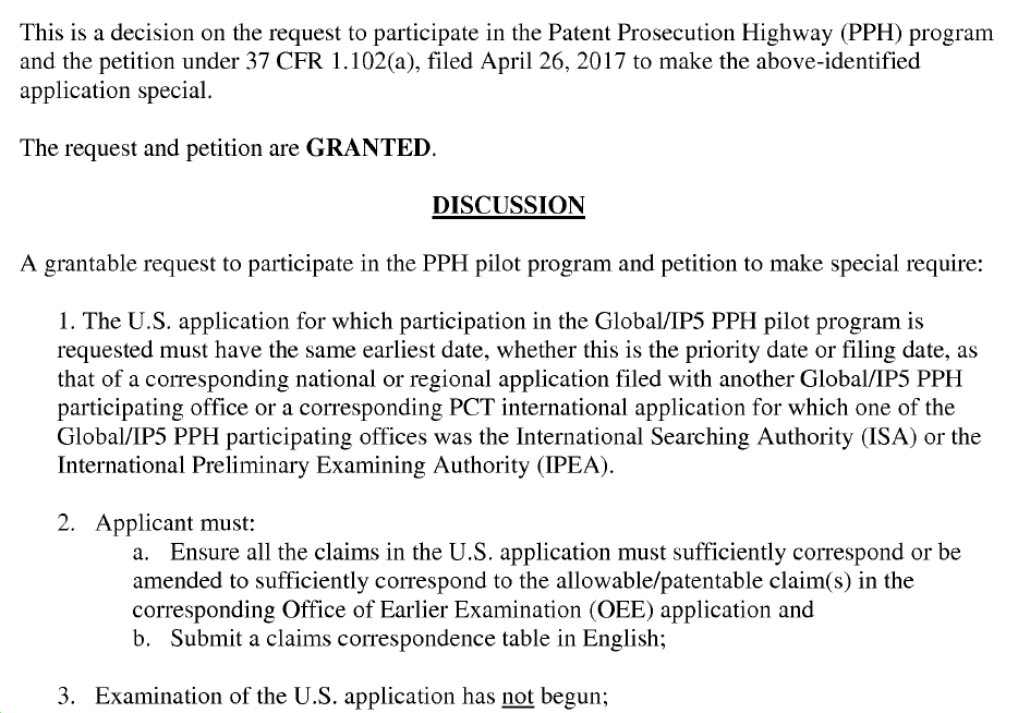 專利審查高速公路(簡稱PPH)是在美國專利申請中常用的加快審查途徑。USPTO是在后申請的審查局,且作為在先申請的審查局經過審查程序認為受理的對應申請包含至少一項可被授權或具有可專利性的權利要求,那么申請人可以向USPTO 請求參與PPH 項目。