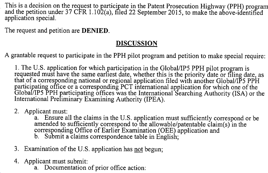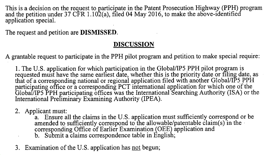 c)PPH拒絕通知(摘錄示例如下圖): 該通知是告知類通知。告知申請人PPH請求被拒絕。 該通知通常是因PPH請求未滿足時機要求(即審查員已開始審查)而產生。