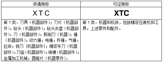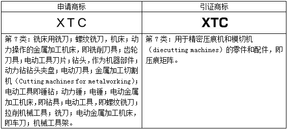“XTC”商標(biāo)第01;06;07類美國(guó)商標(biāo)申請(qǐng)被引證上述相同英國(guó)公司C&T MATRIX LIMITED名下的第7類在先商標(biāo)下發(fā)駁回,同樣部分駁回了申請(qǐng)商標(biāo)在第7類商品上的申請(qǐng)注冊(cè)。申請(qǐng)商標(biāo)和引證商標(biāo)信息具體如下: