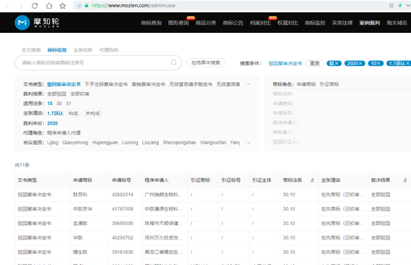 為此,筆者在摩知輪以“肽”為關(guān)鍵字檢索2020年包含“肽”的商標(biāo)駁回復(fù)審決定書(shū),檢索結(jié)果顯示,截止2020年12月3日,共計(jì)出現(xiàn)包含“肽”的商標(biāo)駁回復(fù)審決定書(shū)82件,其中80件予以駁回,僅2件通過(guò)行政訴訟予以初步審定并公告。在82份駁回復(fù)審決定中,71件以《商標(biāo)法》第十條第一款第(七)項(xiàng)“帶有欺騙性,容易使公眾對(duì)商品的質(zhì)量等特點(diǎn)或者產(chǎn)地產(chǎn)生誤認(rèn)的”條款駁回。