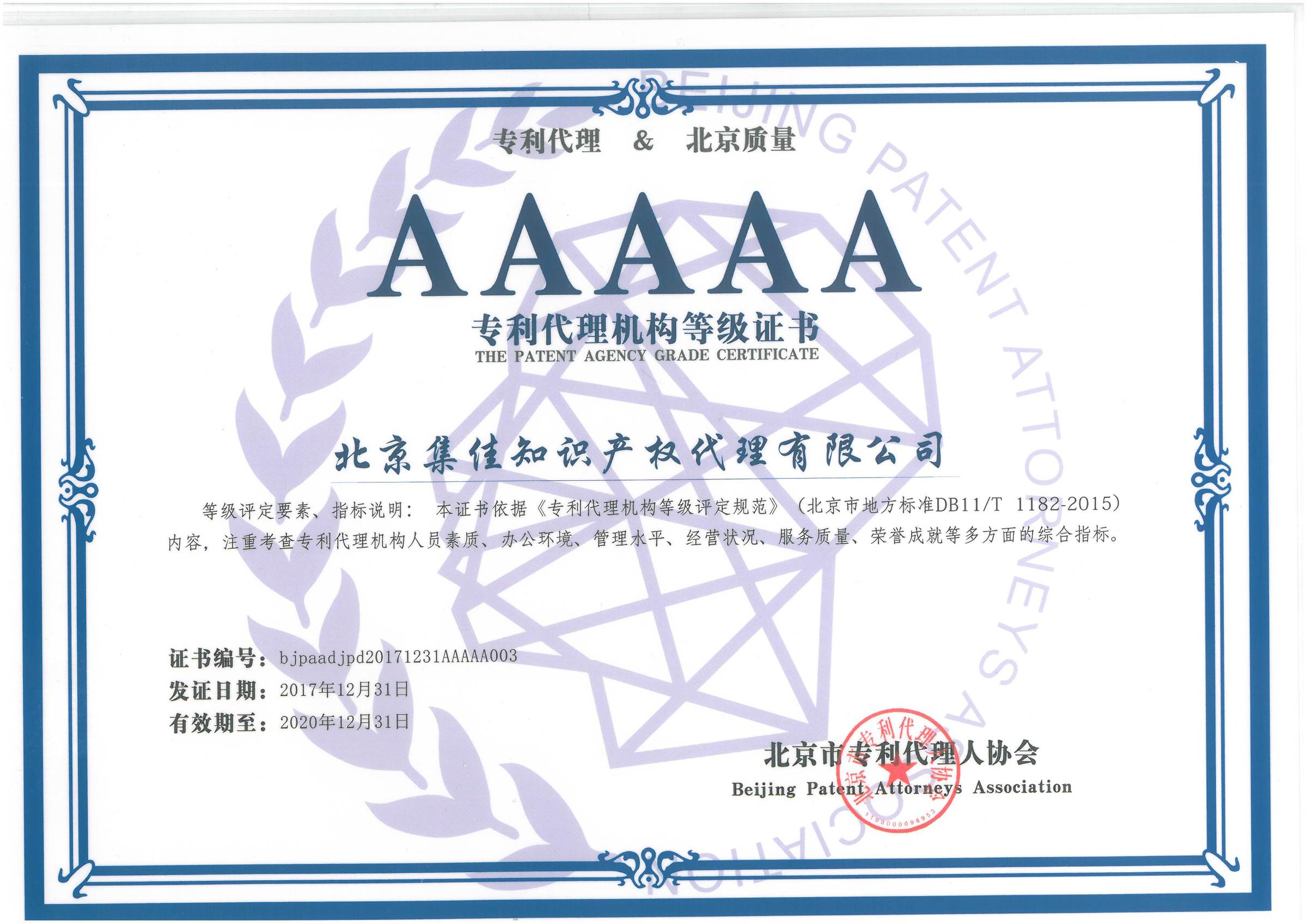集佳刷新2017年“AAAA級專利代理機構”的記錄,在2018年獲評首批“AAAAA級專利代理機構”,工作再一次得到了北京市知識產權局、北京市專利代理人協會、首都知識產權服務業協會以及業界的充分認可和鼓勵。未來,集佳將繼續強化知識產權服務意識,秉承“站在客戶的角度考慮每一個問題”“全身心地關注客戶的每一個細節”的企業理念,不斷提升業務水平,努力為首都知識產權行業的持續健康發展貢獻力量。