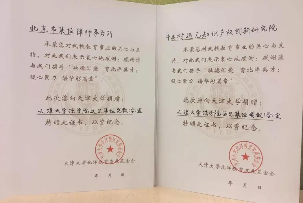 2019年1月中旬,天津大學(xué)北洋教育發(fā)展基金會又專程給集佳送來“捐資證書”,感謝集佳攜手遠見創(chuàng)新研究院通過這一公益之舉,支持與資助天津大學(xué)的教育事業(yè)。