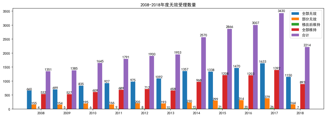 需要指出的是,2018年的數據目前看起來較少,很可能是因為還存在很多尚未完結的案件,因此不能簡單地認為2018年的無效請求數量下降。