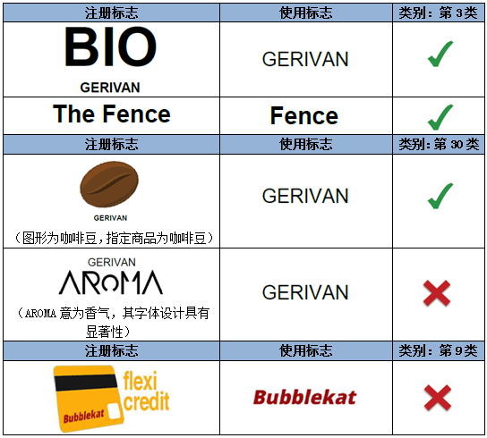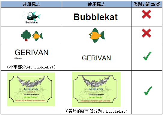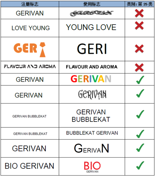如上述示例,注冊商標指定在第32類礦泉水商品上,相較而言,圖形對指定商品具有一定暗示性,而顯著性較弱。因此,文字部分“GERIVAN”為該注冊商標的主要顯著部分。第一組中的使用標志僅是對圖形和文字的位置進行了調(diào)整,不影響文字部分的顯著性。而第二組的使用標志對文字進行了拆分,形成了新的商業(yè)印象,故視為實質(zhì)變更。