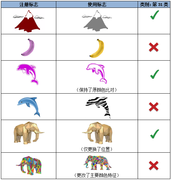 需要留意的是,對于黑白商標和彩色商標,更換顏色(如黑白更換為彩色,或彩色更換為黑白),與國內(nèi)的判斷標準稍有不同。根據(jù)本指南,顏色更改是否構成注冊標志的實質(zhì)變更,判斷標準仍主要取決于是否對注冊標志的顯著要素構成更改,換句話說,“顏色”是否為該注冊標志的顯著要素。如上述示例七中第二組,指定商品為第31類“香蕉”,因此,該注冊標志中的“粉色”為該注冊商標的主要顯著部分,更改為其他顏色則構成實質(zhì)變更,而如上述示例七中的第一、三組,顏色并非注冊商標的主要顯著部分,則可以在使用中更換標志的顏色。