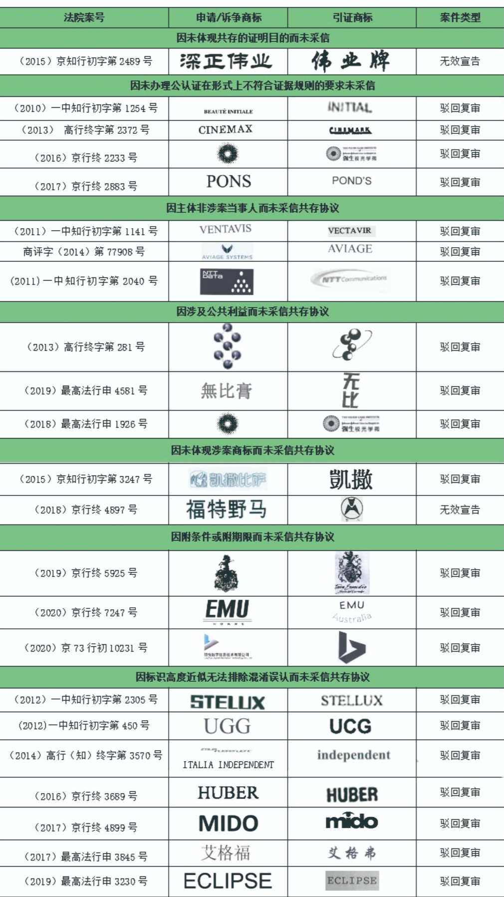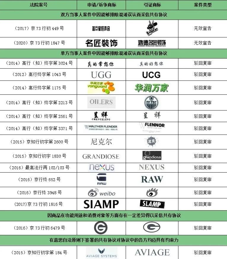 (6)注意提交共存協(xié)議的時間點,從商標申請到被最終駁回無效需要經(jīng)過駁回復審、一審、二審多個程序,提交共存協(xié)議并非這些程序的法定中止審理事由,只要引證商標在審理時處于有效狀態(tài),就會對申請商標予以駁回。因此應盡可能早的提交共存協(xié)議,避免浪費時間和司法資源,導致喪失權利救濟,例如最高院(2018)最高法行申5731號和北高院(2016)京行終5385號案件。