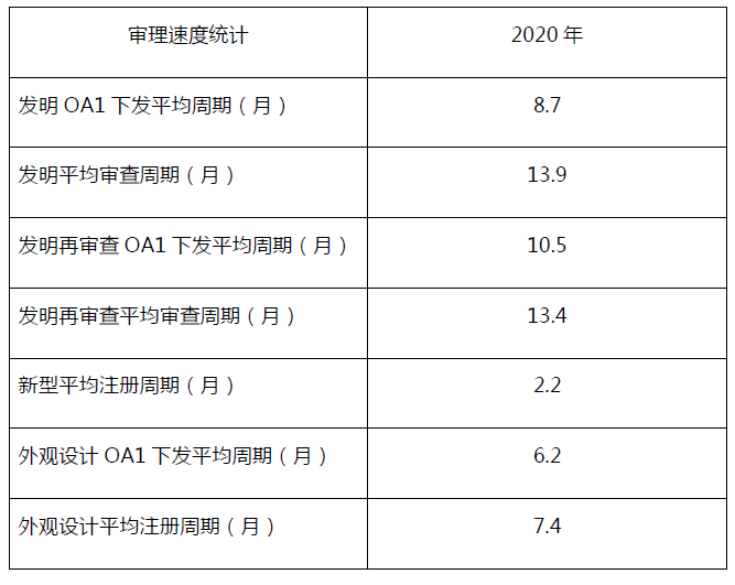 2020年中國臺灣智慧財產局審理速度統計,見下表: