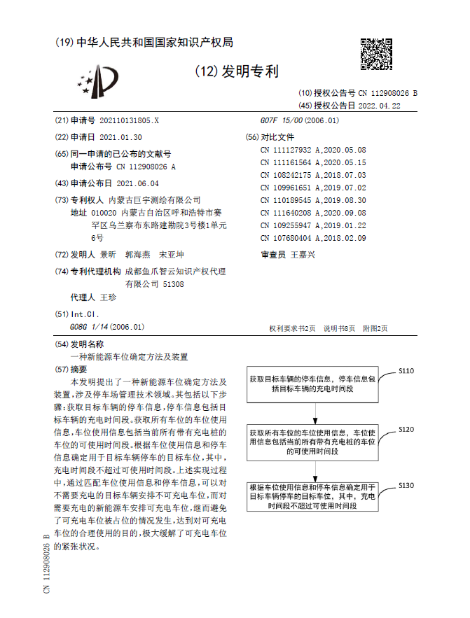 涉案專利“一種新能源車位確定方法及裝置”ZL202110131805.X