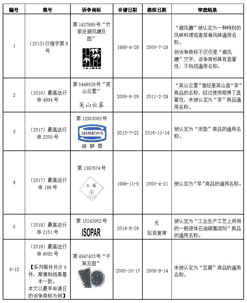 經(jīng)查閱從2015年至今,中國裁判文書網(wǎng)收錄最高人民法院涉及“通用名稱”商標(biāo)確權(quán)案件的行政裁判文書共計12份,包括11份行政裁定書和1份行政判決書,裁判作出的時間是2015年至2019年。筆者以這些文書為研究樣本,分析商標(biāo)確權(quán)中法院認(rèn)定通用名稱的考量因素和裁判標(biāo)準(zhǔn)。