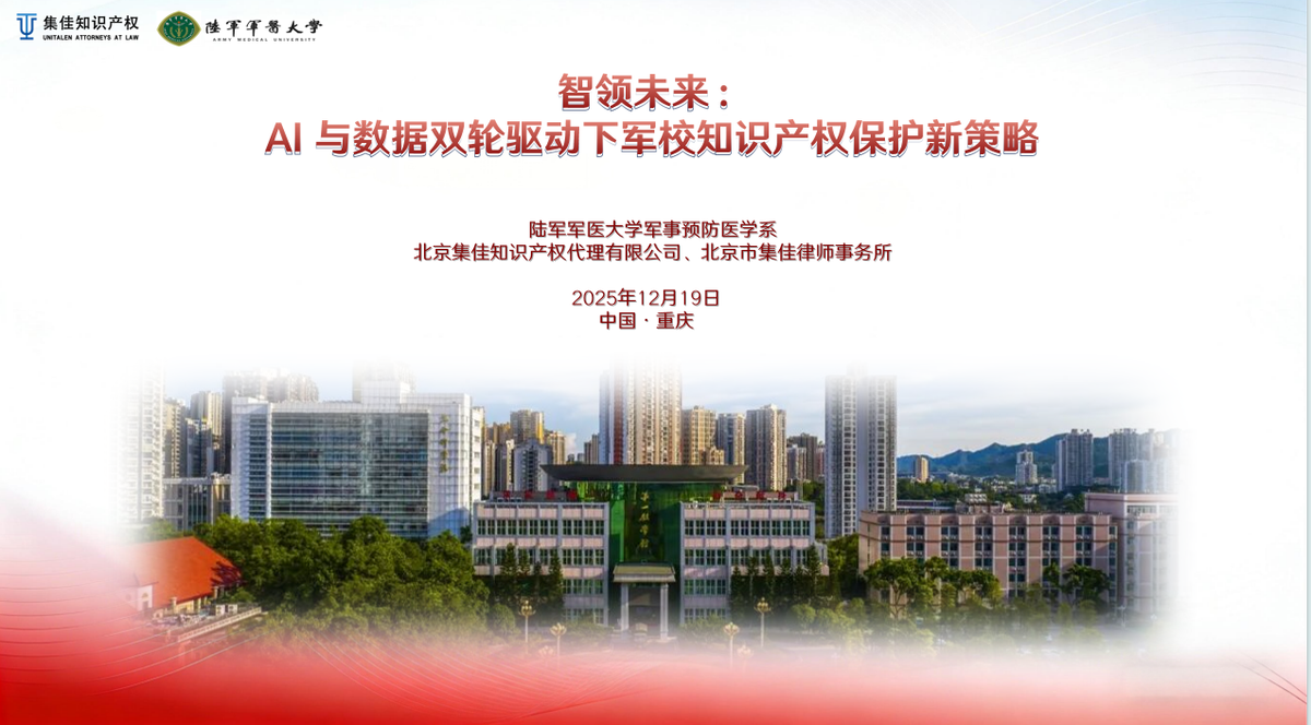 為響應國家知識產(chǎn)權強國建設戰(zhàn)略,助力國防科技領域科研成果的合規(guī)保護與高效轉化,2025年12月19日下午,北京集佳知識產(chǎn)權代理有限公司、北京市集佳律師事務所聯(lián)合陸軍軍醫(yī)大學軍事預防醫(yī)學系,成功舉辦"智領未來:AI與數(shù)據(jù)雙輪驅動下軍校知識產(chǎn)權保護新策略"專題講座。本次活動聚焦軍事醫(yī)學領域知識產(chǎn)權保護痛點難點,為該校系領導、各單位主任、分管科研副主任及科研骨干等帶來了一場高規(guī)格、實用性強的學術盛宴,獲得參會人員一致好評。